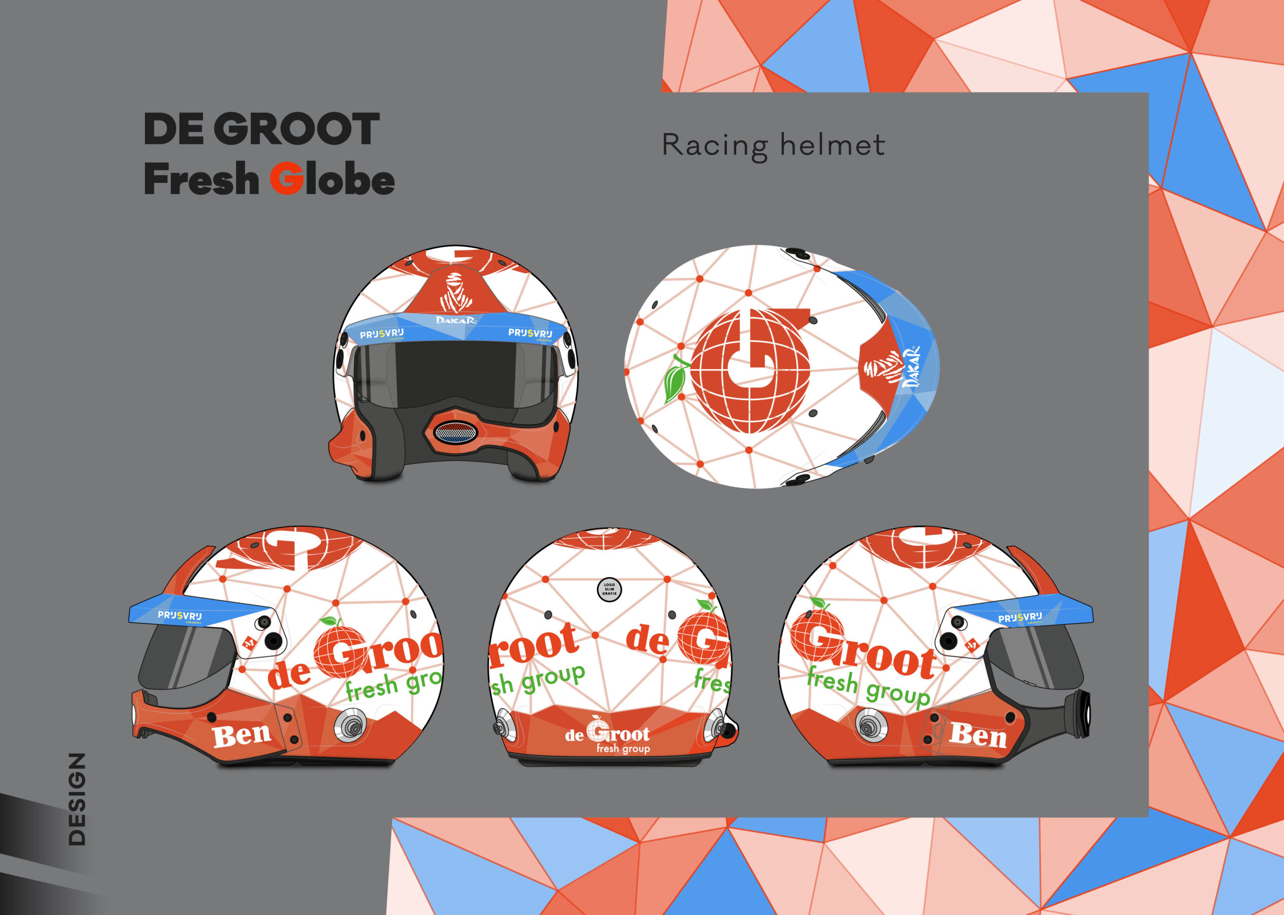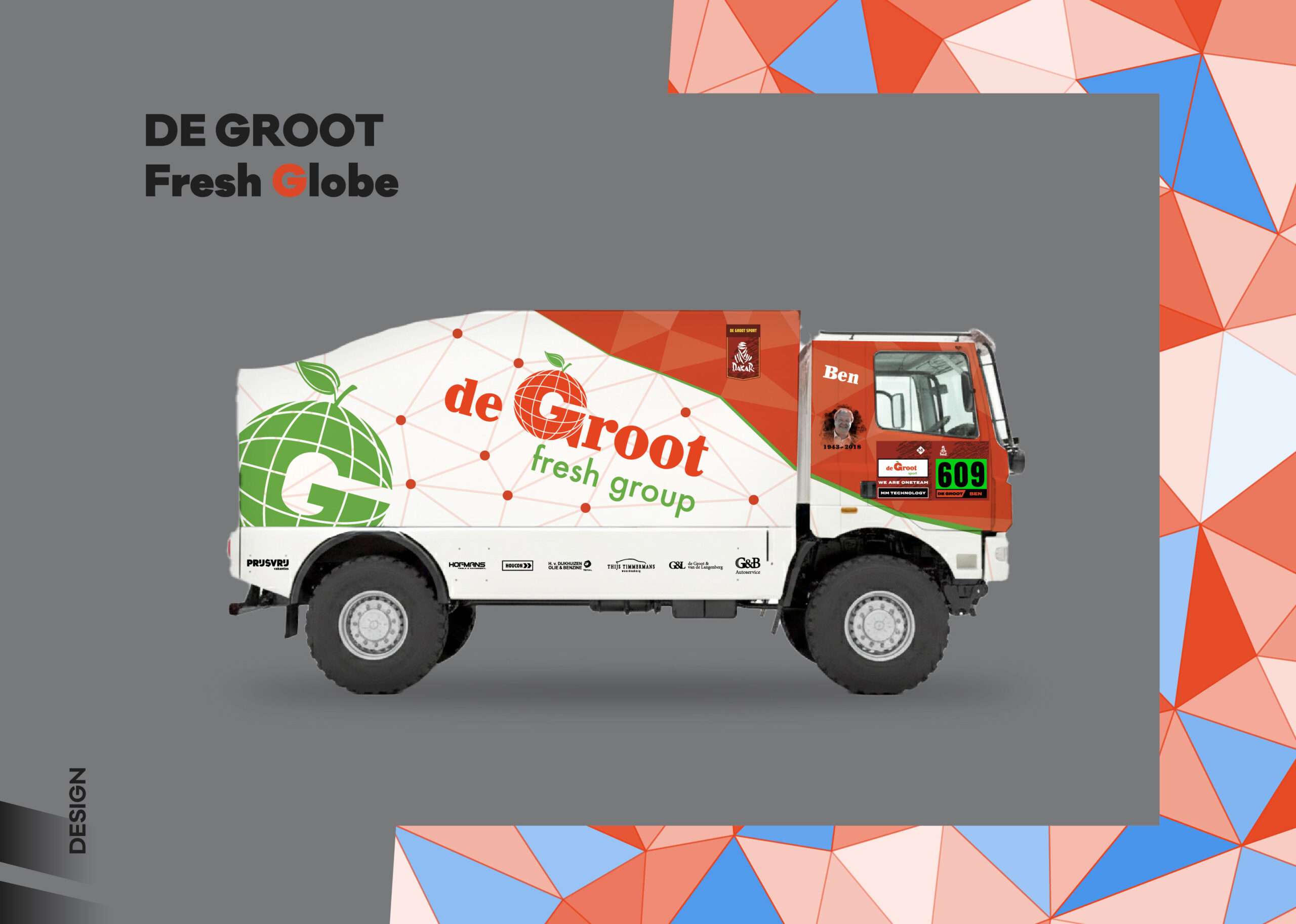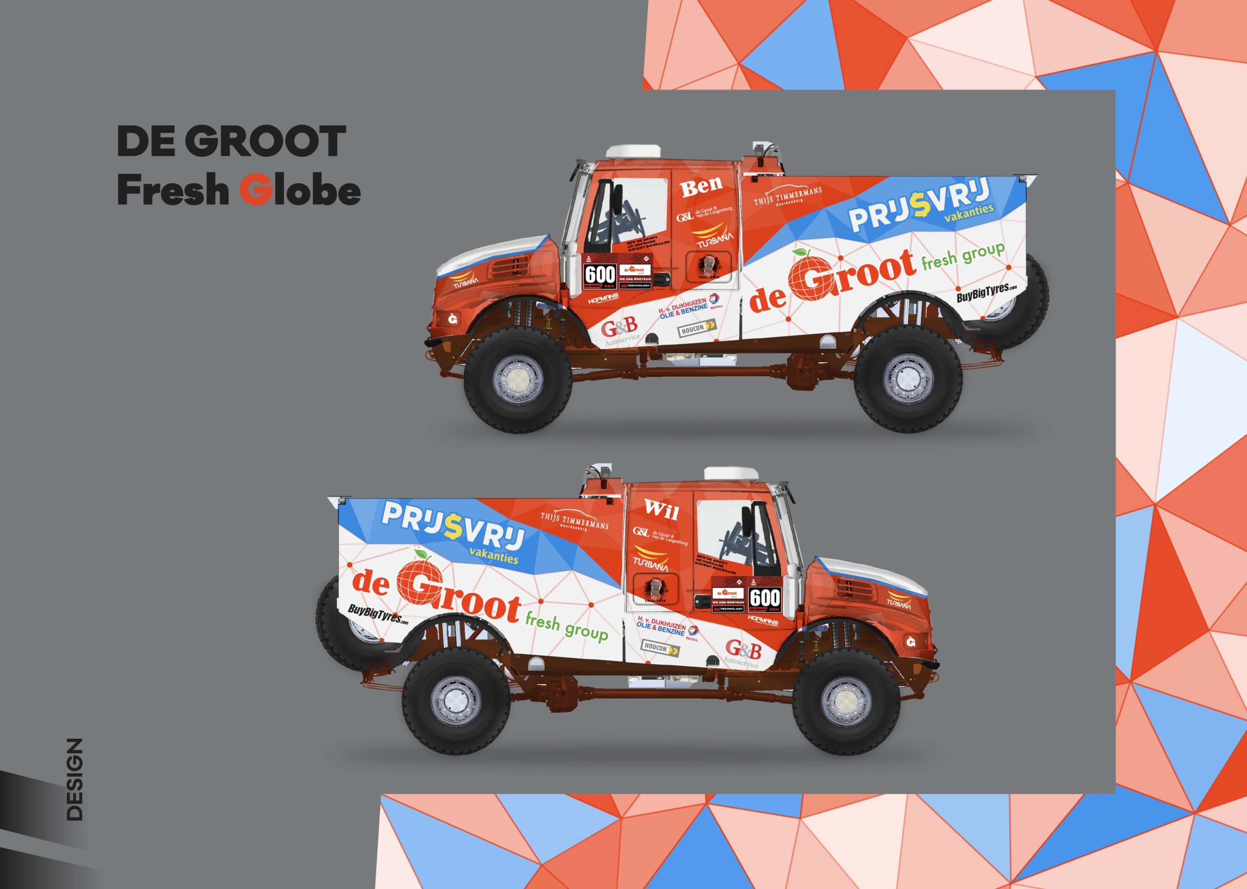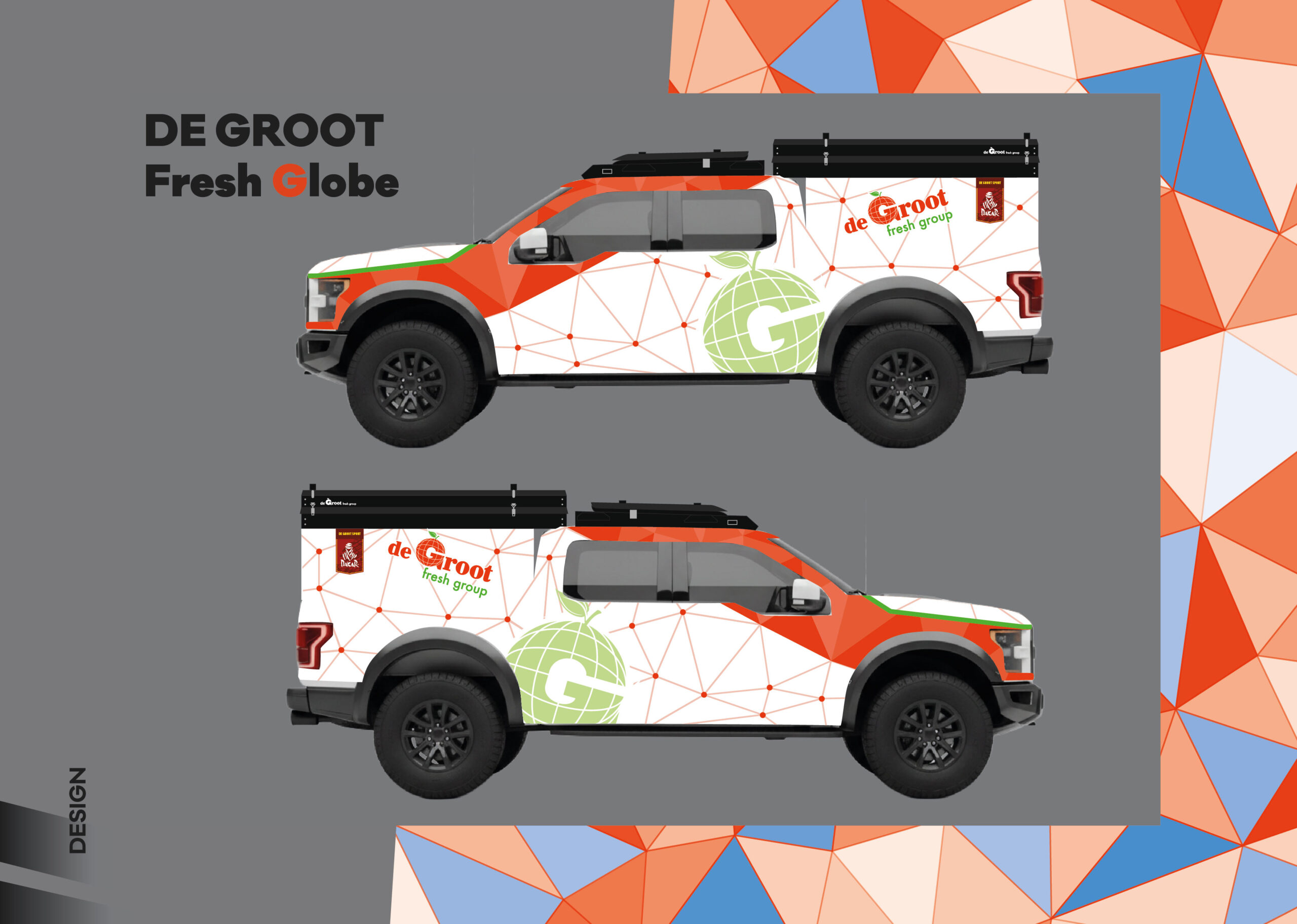 New identity, modern direction. Forthe De Groot Sport team, we created a comprehensive visual concept that bridges the world of motorsport with their global business. Out of three proposed variants, the winning design reflects freshness and the dynamic structure of a global network. We applied this motif to two racing trucks, support vehicles, team race suits, and helmets.The result is a design that is impossible to miss in the desert. Being entrusted to completely reshape the team’s visual identity is, for us, a confirmation that our creative vision hits the mark.