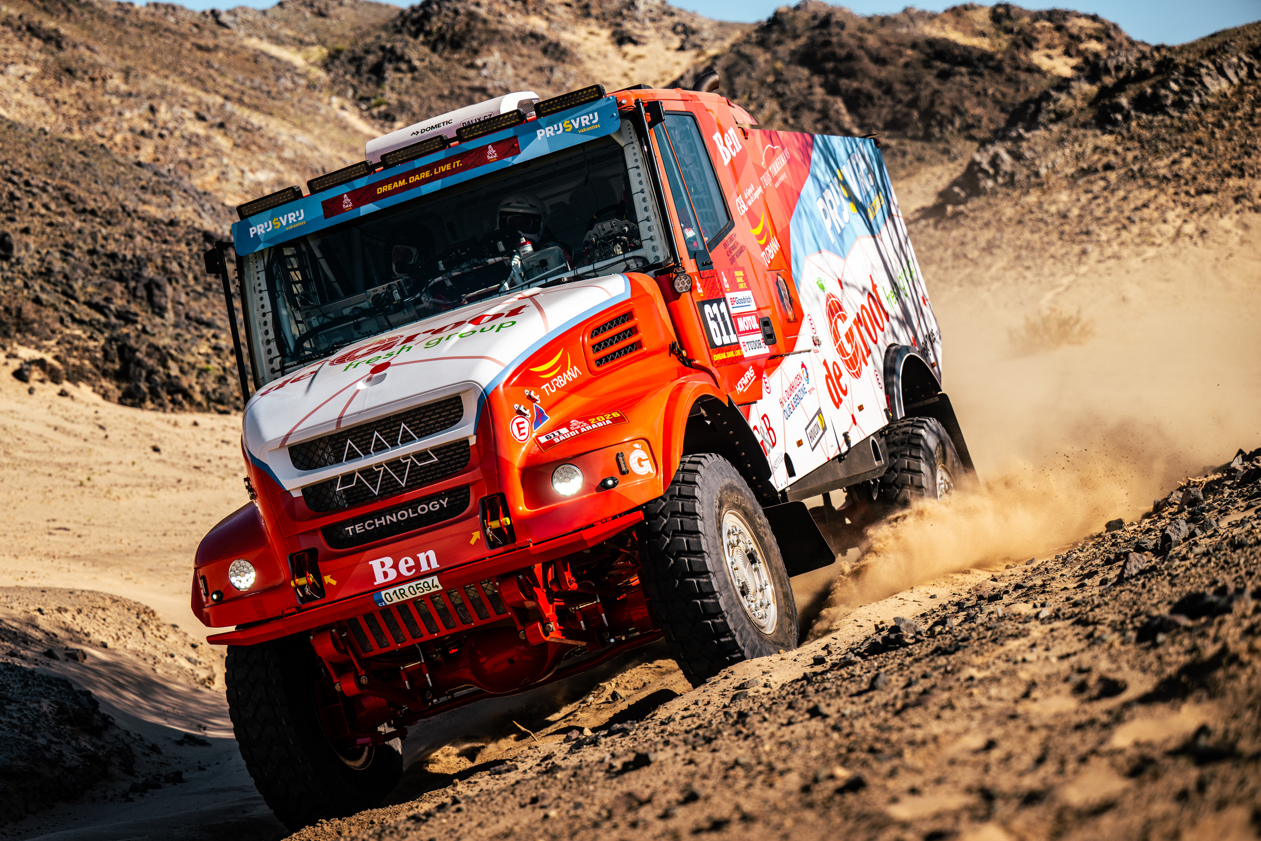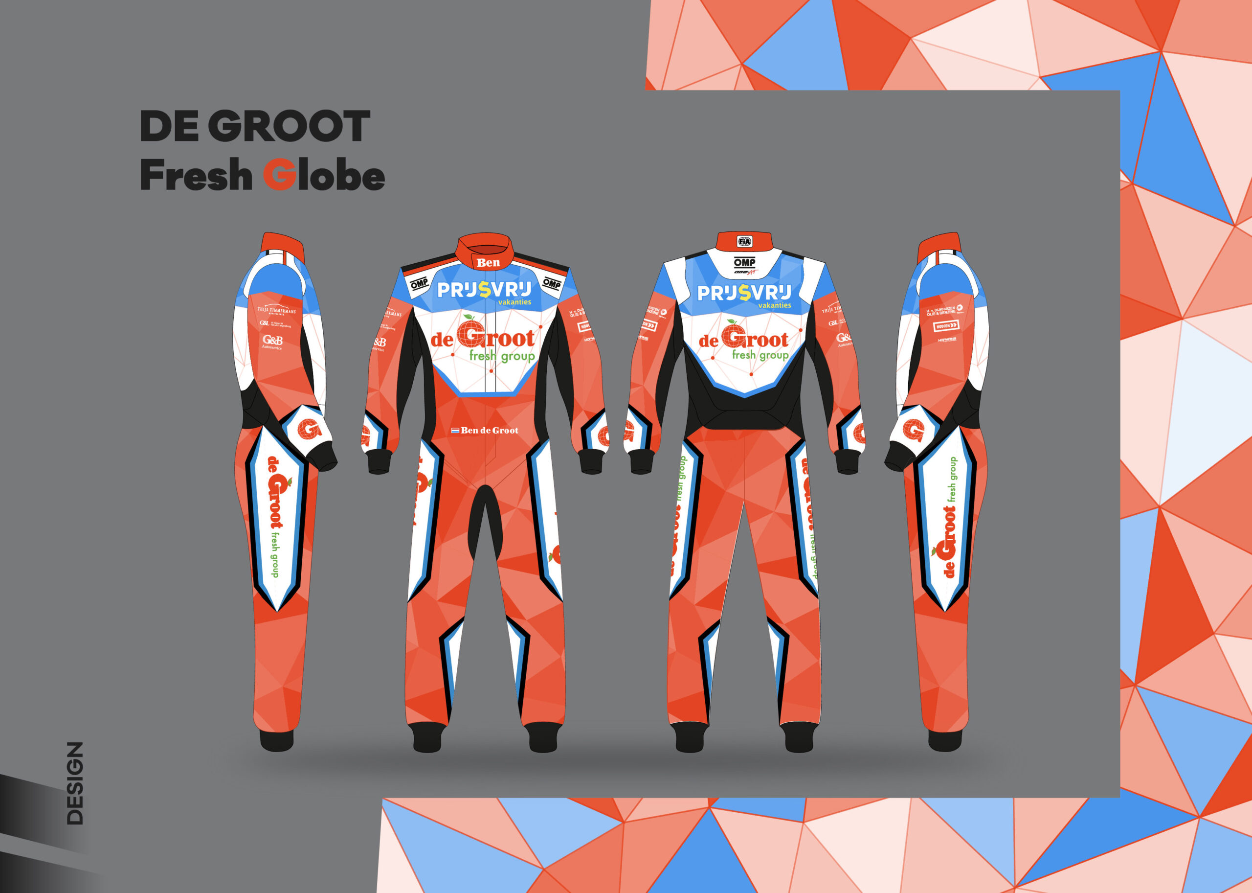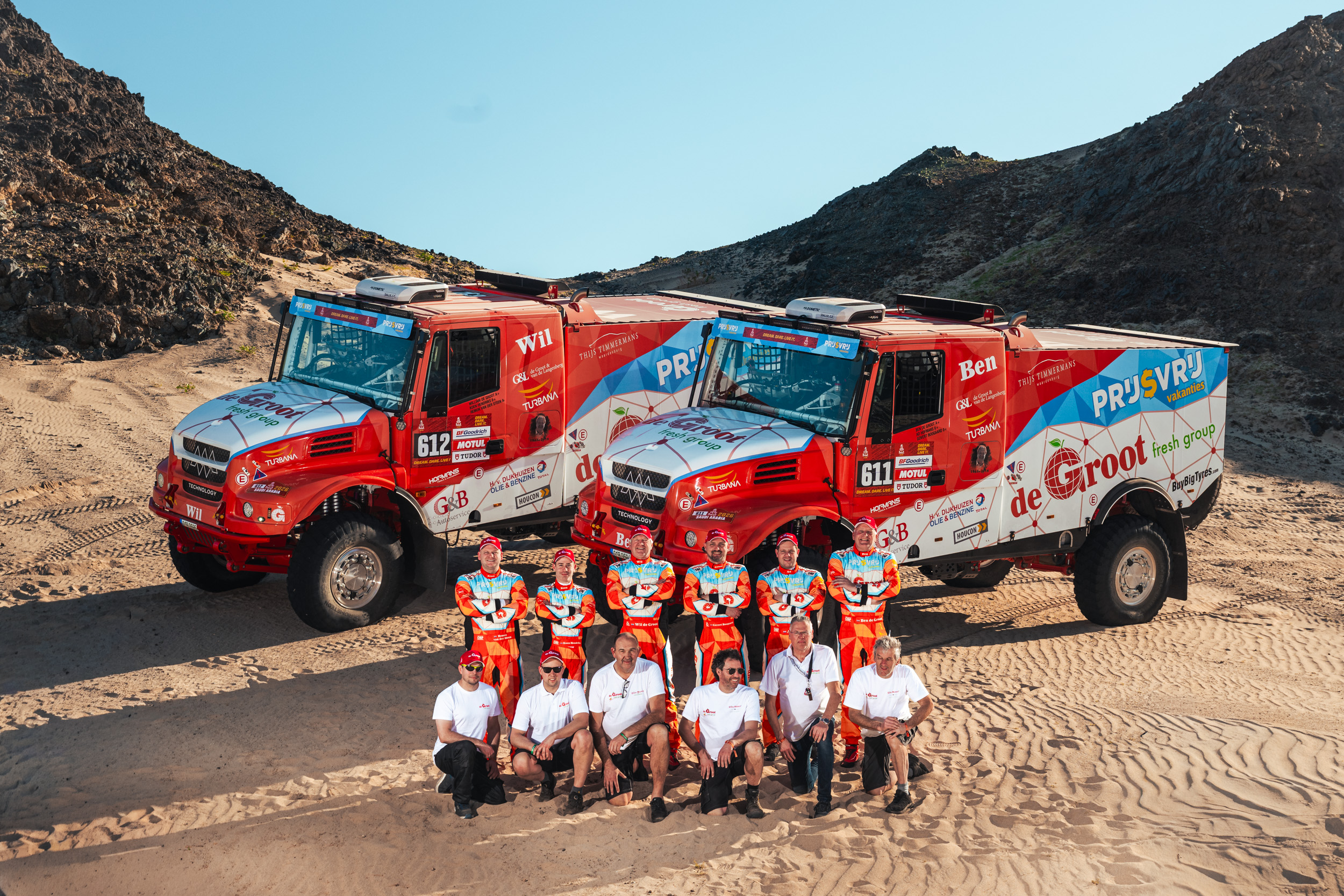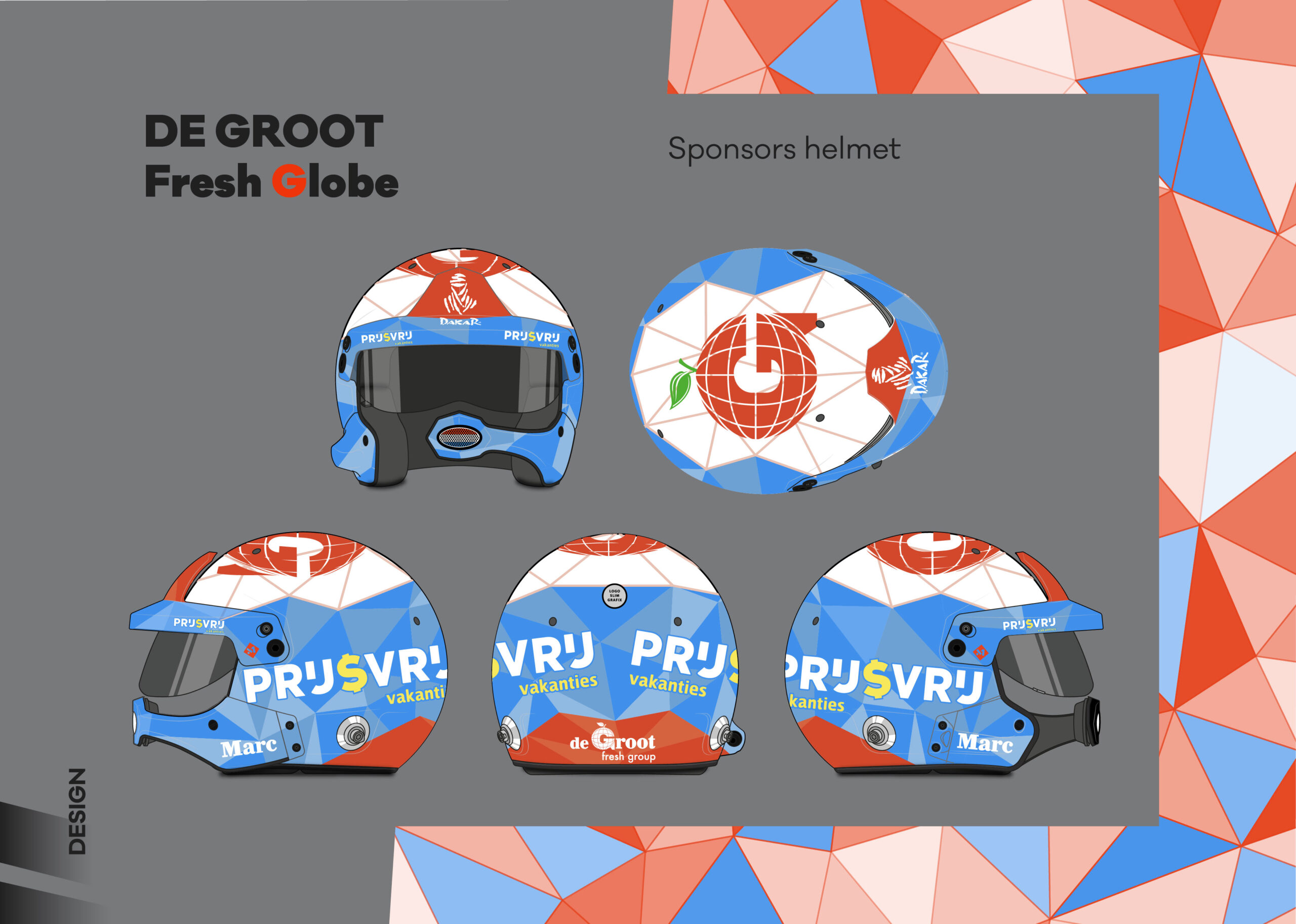 New identity, modern direction. Forthe De Groot Sport team, we created a comprehensive visual concept that bridges the world of motorsport with their global business. Out of three proposed variants, the winning design reflects freshness and the dynamic structure of a global network. We applied this motif to two racing trucks, support vehicles, team race suits, and helmets.The result is a design that is impossible to miss in the desert. Being entrusted to completely reshape the team’s visual identity is, for us, a confirmation that our creative vision hits the mark.